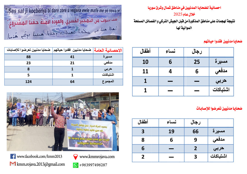احصائية للضحايا المدنيين في مناطق شمال وشرق سوريا خلال عام 2025 نتيجة لهجمات على المناطق المذكورة من قبل الجيش التركي و الفصائل المسلحة الموالية لها نشرت بواسطة: kmmrojava في manshet, الأخبار, نشاطات 9 أكتوبر، 2025 2025-10-09 kmmrojava