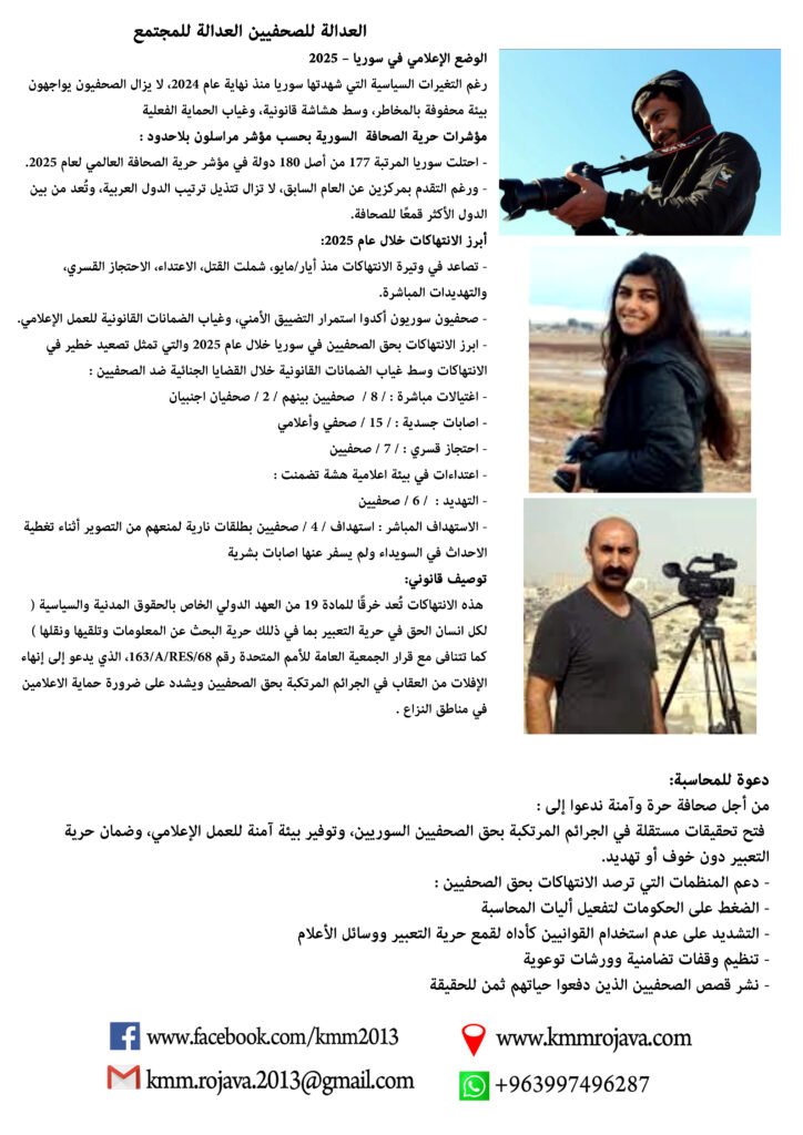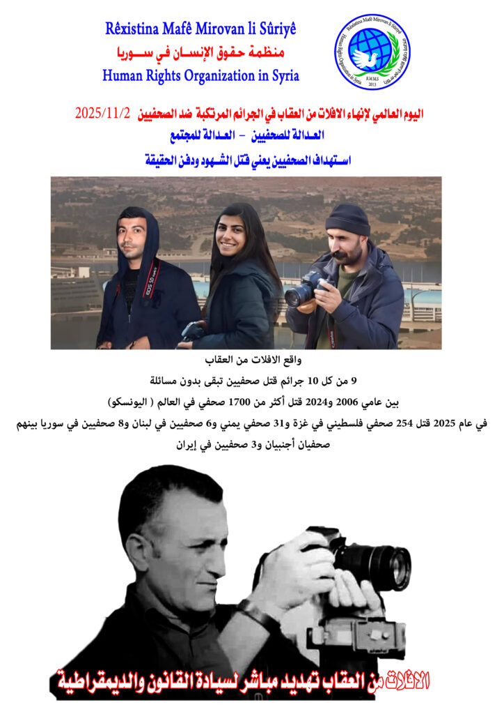 اليوم العالمي لإنهاء الافلات من العقاب قي الجرائم المرتكبة ضد الصحفيين 2/11/2025 العدالة للصحفيين – العدالة للمجتمع نشرت بواسطة: kmmrojava في manshet, الأخبار, نشاطات 3 نوفمبر، 2025 2025-11-03 kmmrojava